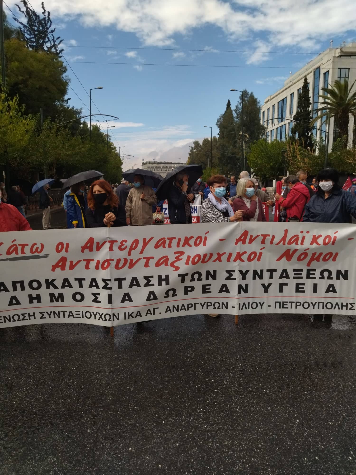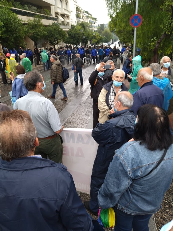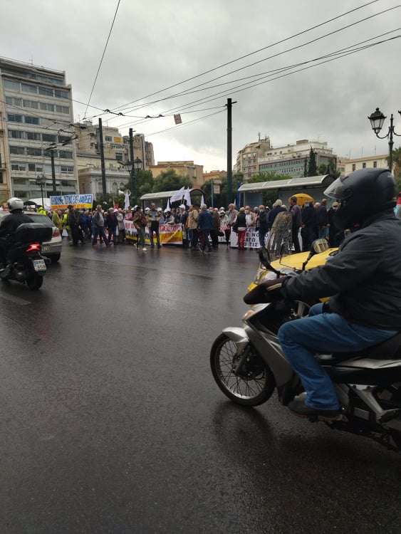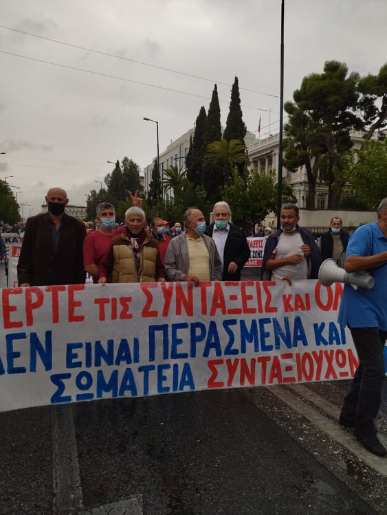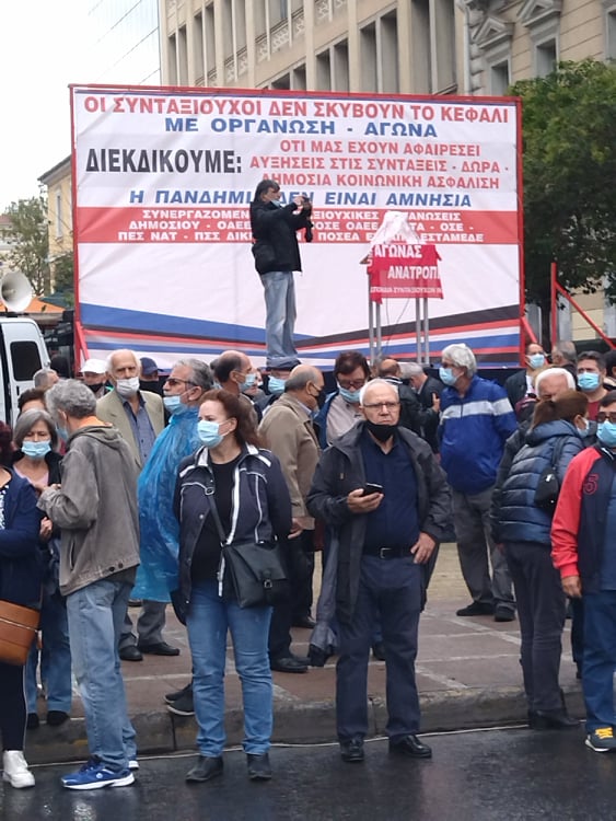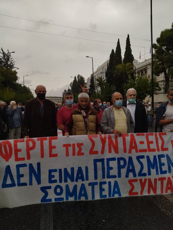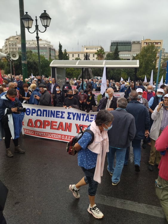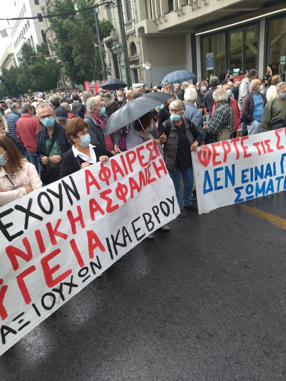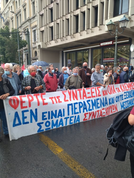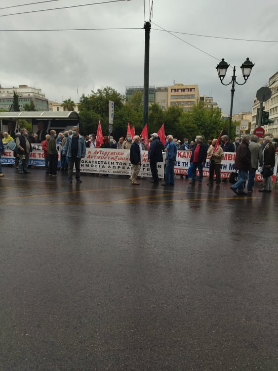 «Για τους συνταξιούχους δεν υπάρχει μία, λεφτά υπάρχουν μόνο για την πλουτοκρατία» και «Εμπρός λαέ μη σκύβεις το κεφάλι, ο μόνος δρόμος είναι αντίσταση και πάλη», ήταν μεταξύ των συνθημάτων των συνταξιούχων που συγκεντρώθηκαν στην πλ. Κλαυθμώνος, όπου μίλησε ο Δήμος Κουμπούρης – πρόεδρος της Ομοσπονδίας Συνταξιούχων ΙΚΑ και αμέσως μετά, παρά τη δυνατή βροχή, πορεύθηκαν δυναμικά ως το Μέγαρο Μαξίμου.