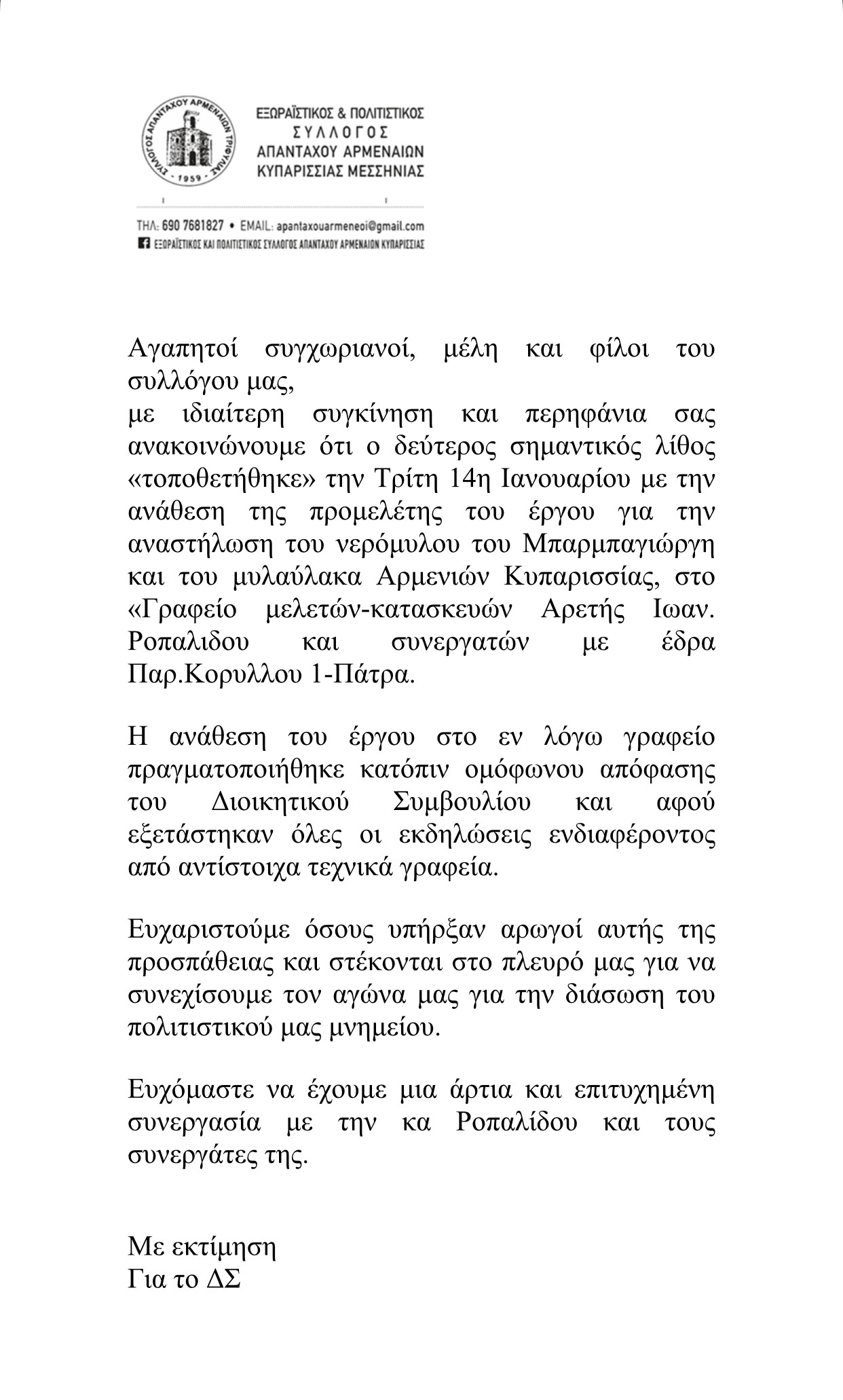 Όπως αναφέρει σχετικά ο Εξωραϊστικός και Πολιτιστικός Σύλλογος Απανταχού Αρμεναίων Κυπαρισσίας Μεσσηνίας η ανάθεση του έργου στο γραφείο μελετών -κατασκευών της κας Αρετής Ιωαν. Ροπαλίδου και συνεργατών έγινε κατόπιν ομόφωνης απόφασης του δημοτικού Συμβουλίου και πλέον το έργο μπαίνει σε «ράγες» προς την υλοποίησή του.