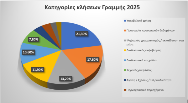 Στην κορυφή των κατηγοριών με τις περισσότερες κλήσεις βρίσκεται η υπερβολική χρήση του διαδικτύου, επιβεβαιώνοντας ότι η διαχείριση του χρόνου οθόνης και η ισορροπία μεταξύ ψηφιακής και μη ψηφιακής ζωής παραμένουν βασική πρόκληση για τους ανήλικους χρήστες. Η υπερβολική χρήση του διαδικτύου από τα παιδιά, τόσο στα διαδικτυακά παιχνίδια όσο και στα μέσα κοινωνικής δικτύωσης, παραμένει το κυρίαρχο ζήτημα για το οποίο απευθύνονται οικογένειες και εκπαιδευτικοί στη Γραμμή Βοηθείας. Οι περιπτώσεις που καταγράφονται κυμαίνονται από ήπιες δυσκολίες απομάκρυνσης από τις οθόνες, όπου τα παιδιά παραμένουν λειτουργικά, έως σοβαρότερες μορφές υπερβολικής χρήσης, που συνοδεύονται από απώλεια λειτουργικότητας, παραμέληση σχολικών υποχρεώσεων και περιορισμό κοινωνικών δραστηριοτήτων.