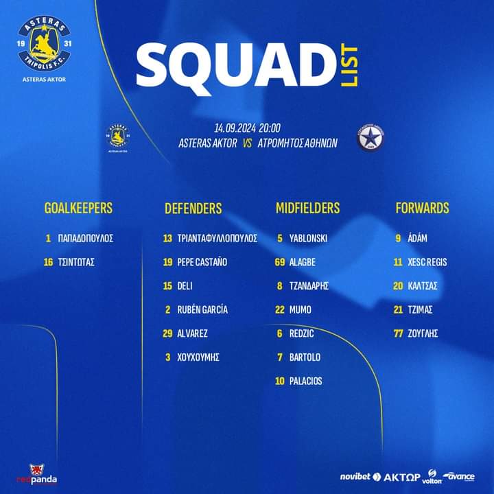 Σήμερα ανακοινώθηκε η αποστολή για τον αγώνα της Αρκαδικής ομάδας με τον Ατρόμητο. Ο Alho προπονείται πλέον κανονικά, ακόμη δεν είναι 100% έτοιμος