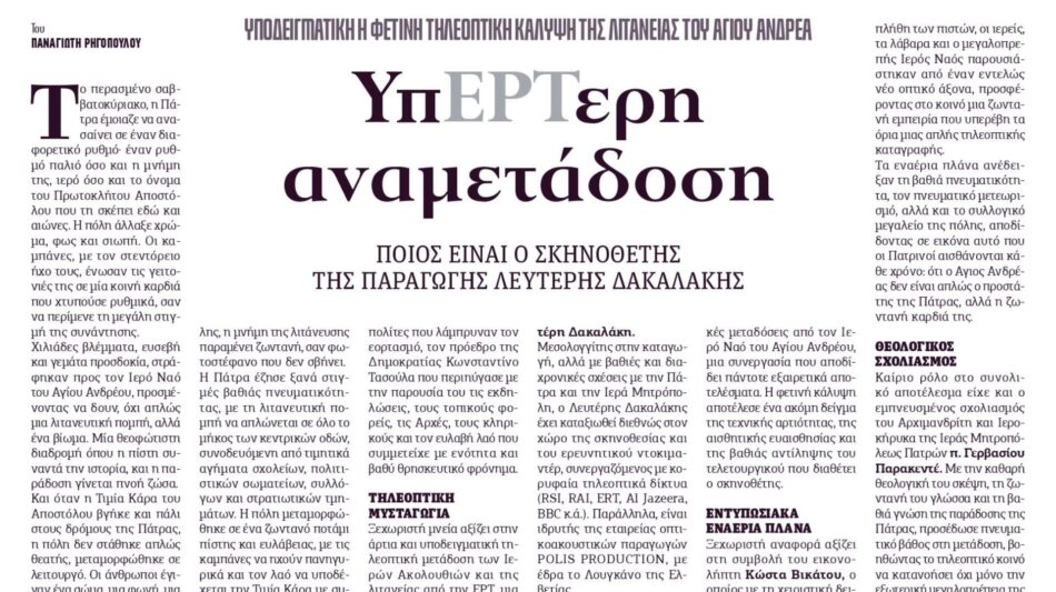 το οποίο δημοσιεύτηκε στην έντυπη έκδοση του περασμένου Σαββατοκύριακου της Εφημερίδας, Peloponnisos.
