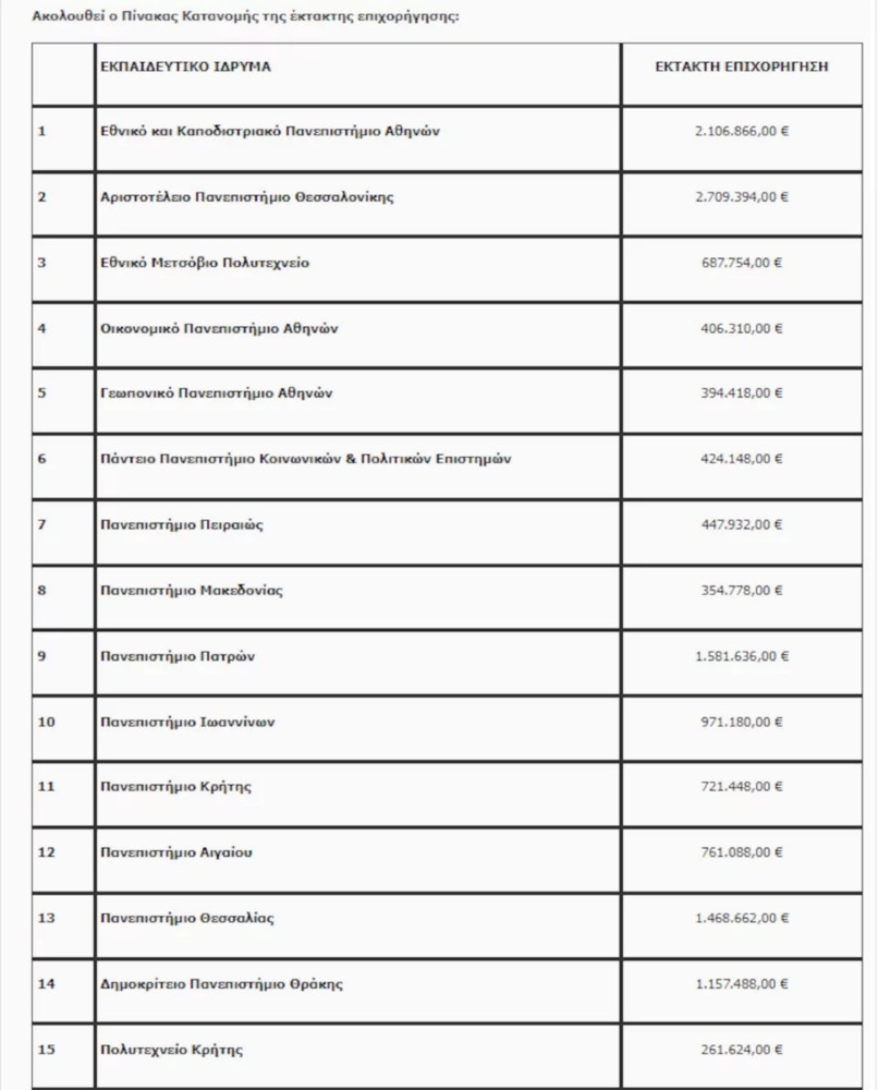 Τονίζεται ότι η έκτακτη αυτή χρηματοδότηση, όπως και η τακτική, δίνεται πλέον στη βάση αντικειμενικών κριτηρίων που έχει εισηγηθεί στο Υπουργείο η Εθνική Αρχή Ανώτατης Εκπαίδευσης και λαμβάνουν υπόψιν π.χ. τον αριθμό των φοιτητών, τον αριθμό των τμημάτων, τη γεωγραφική διασπορά του Ιδρύματος».