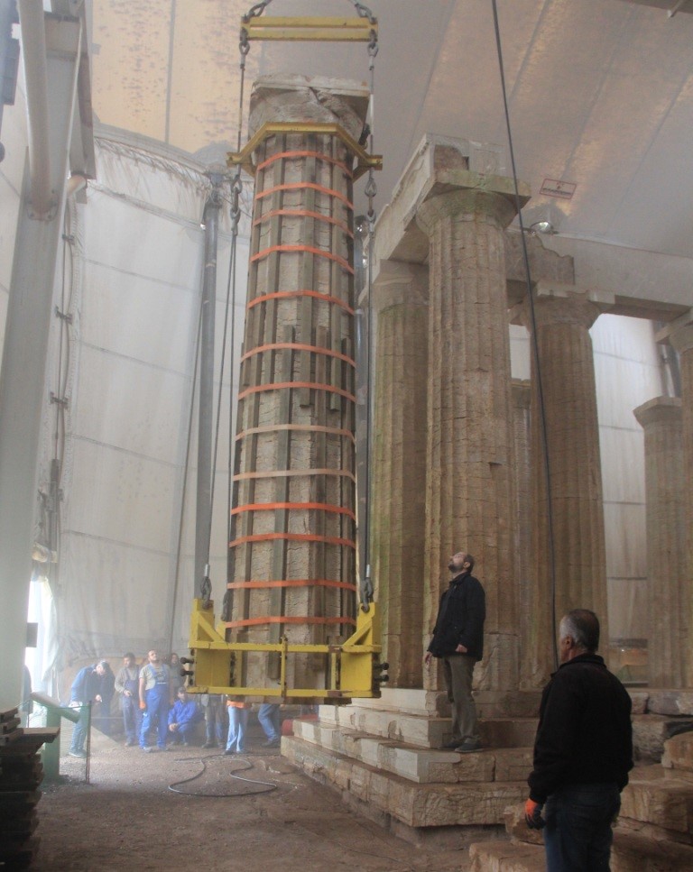 (β) την αποκατάσταση και αναστήλωση στη βόρεια όψη του μνημείου τριών εκ των έξι ελλειπόντων λίθων του επιστυλίου, για τους οποίους σύμφωνα με πρόσφατη σχετική μελέτη είναι γνωστό ότι ο ένας εξ αυτών είχε καταρρεύσει περί τον 13ο ή τον 14ο μ.Χ. αιώνα, πιθανώς ως συνέπεια ενός ισχυρού σεισμού από κοινού με ολίγους άλλους, ενώ οι άλλοι δύο λίθοι ανετράπησαν το καλοκαίρι του 1812, από τους τότε ανασκαφείς του αρχαίου ναού, για να εξαλειφθεί το ενδεχόμενο να καταπέσουν κατά τη διάρκεια των εργασιών.